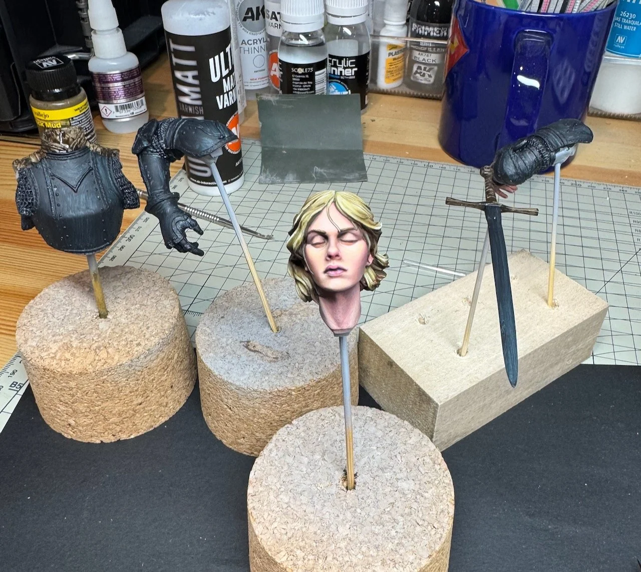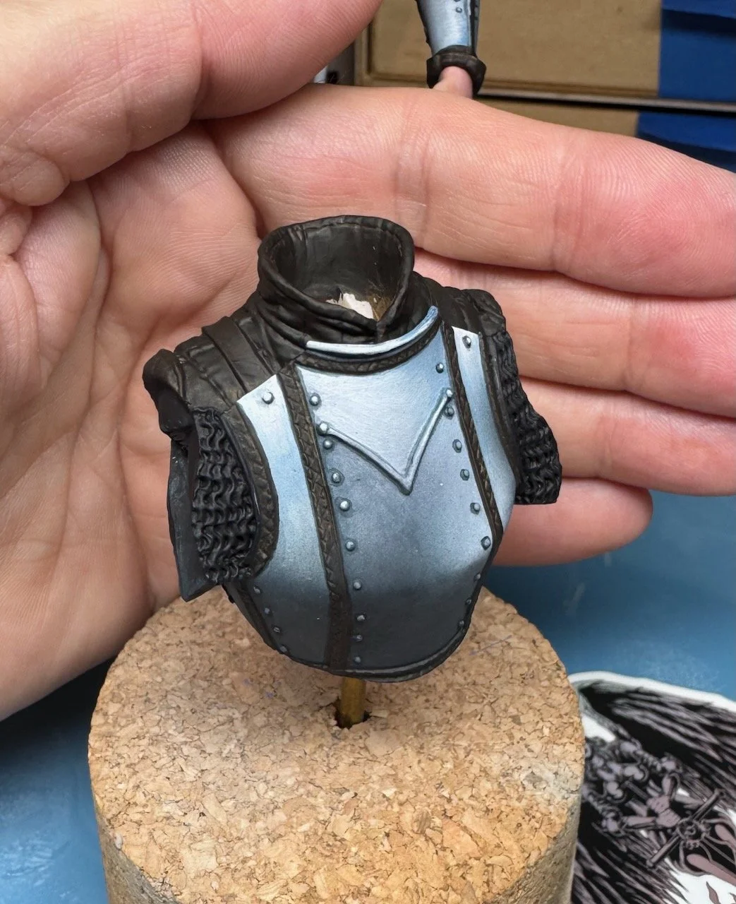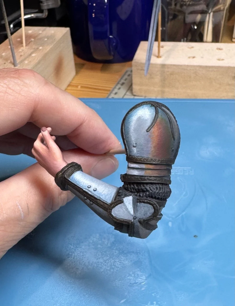 I’ve been working on this fantastic piece from Young Miniatures recently. I thought I’d share some of the work-in-progress shots as I work through the challenges NMM painting. So far I’ve been focussing on the steel, but I have the bronze detail elements blocked in. I’m trying something new this go around - I used my airbrush to soften up some of the tones after I did my initial sketch. I’ll post more shots as I go.
