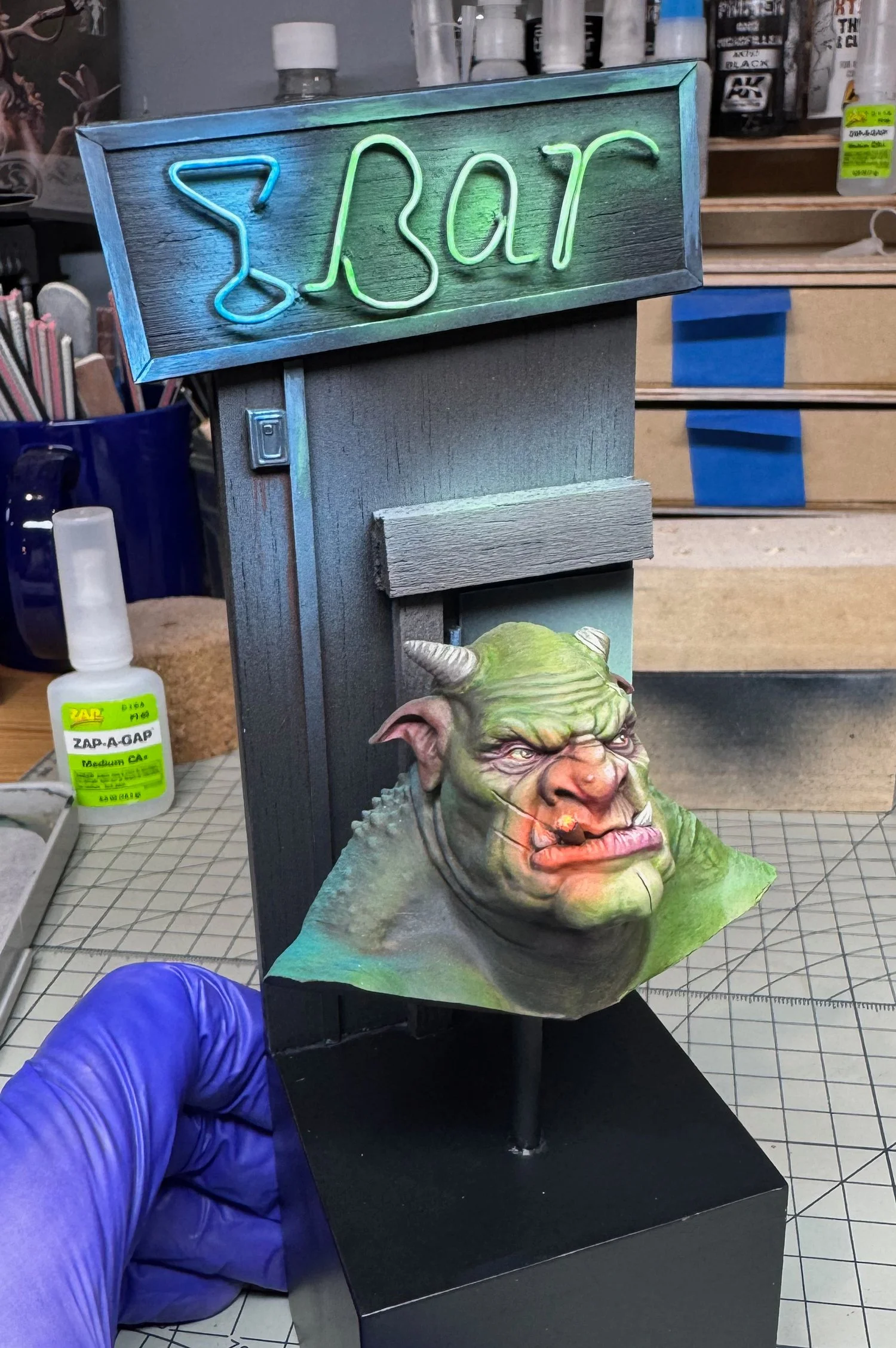 Every bouncer needs a bar door to guard, so I built him one using some mixed balsa and styrene I had laying around the shop. The main element was going to be a neon sign that I could use as an OSL element, casting blue and green lighting across our ogre’s back and shoulder. All went to plan pretty quickly, with the exception of several puncture wounds while I was attempting to manipulate the paper clips for the sign letters. Talk about bleeding for your art! Once everything was built, I primed using Mr. Surfacer 1000 and then applied initial coats using an airbrush. The sign letters were base coated white, so the airbrush and subsequent neon paint brush work would “pop”.